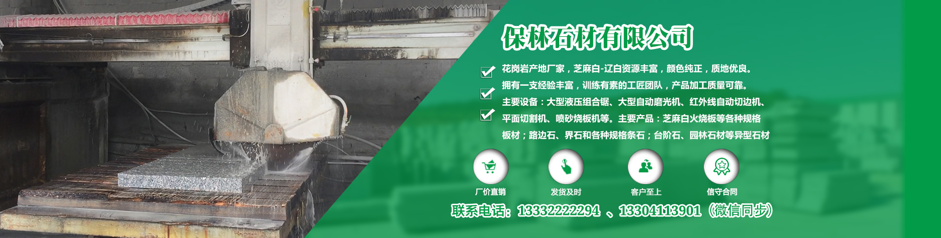 莊河市保林石材有限公司主要產(chǎn)品有噴砂板、火燒板、磨光板、機(jī)刨板、廣場(chǎng)板、外墻干掛板、樓梯踏步板、盲道板等各種板材和路邊石、界石等各種規(guī)格條石;馬蹄石、擋車石球、石柱、界碑、里程碑、工程碑、欄桿、欄板、門牌石、墓園石材、園林石材等異型石材和石雕產(chǎn)品。可承攬大型建筑道路、園林、公墓工程石材供貨。公司于2016年取得ISO質(zhì)量和環(huán)境體系認(rèn)證。公司旗下設(shè)有石材加工廠,主要經(jīng)營(yíng)石材加工、銷售、墓園石雕、土方石工程施工。主要設(shè)備有大型液壓組合鋸、紅外線自動(dòng)切機(jī)、噴砂板、燒板機(jī)、挖掘機(jī)等國(guó)內(nèi)先進(jìn)設(shè)備,技術(shù)熟練,工藝先進(jìn)。